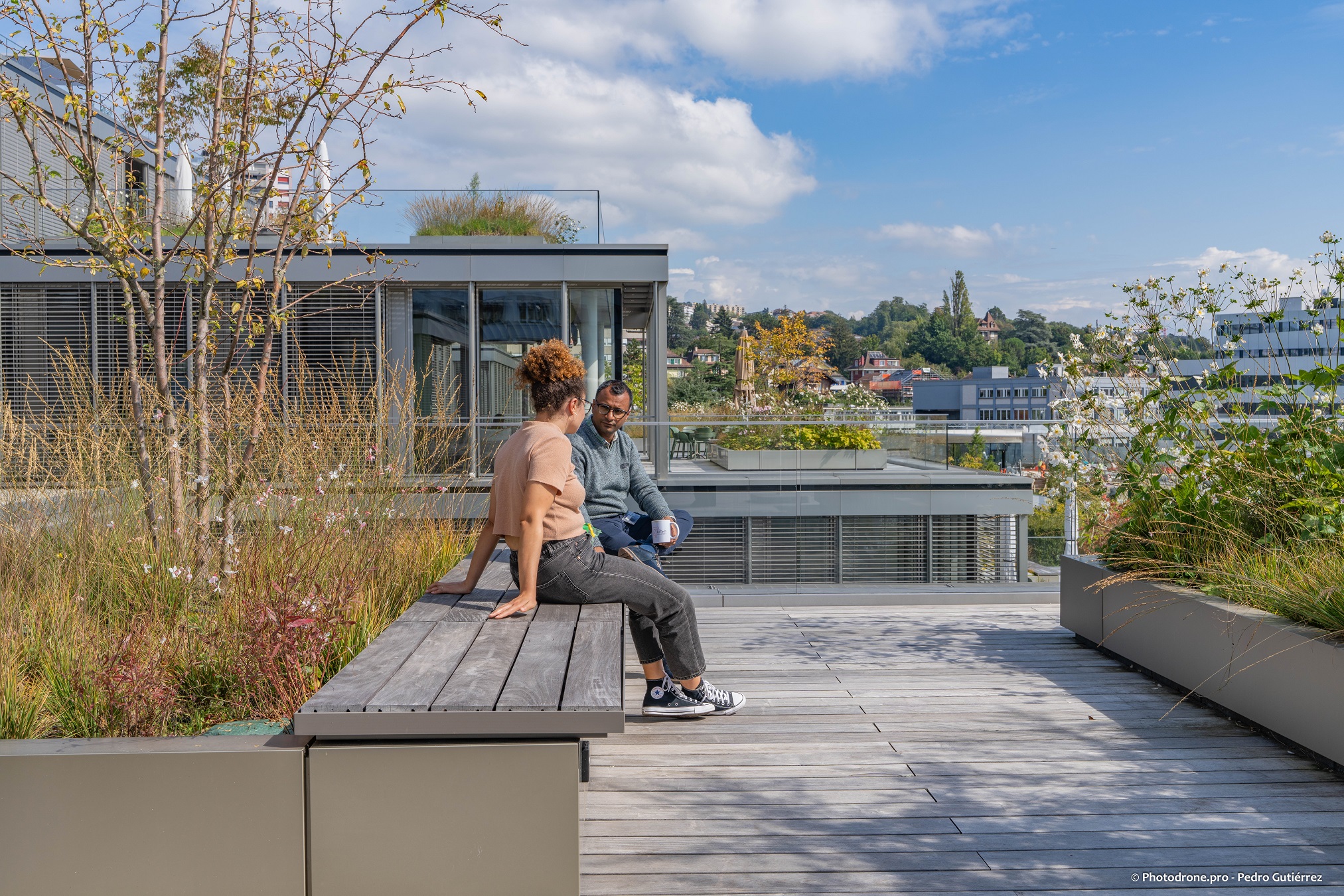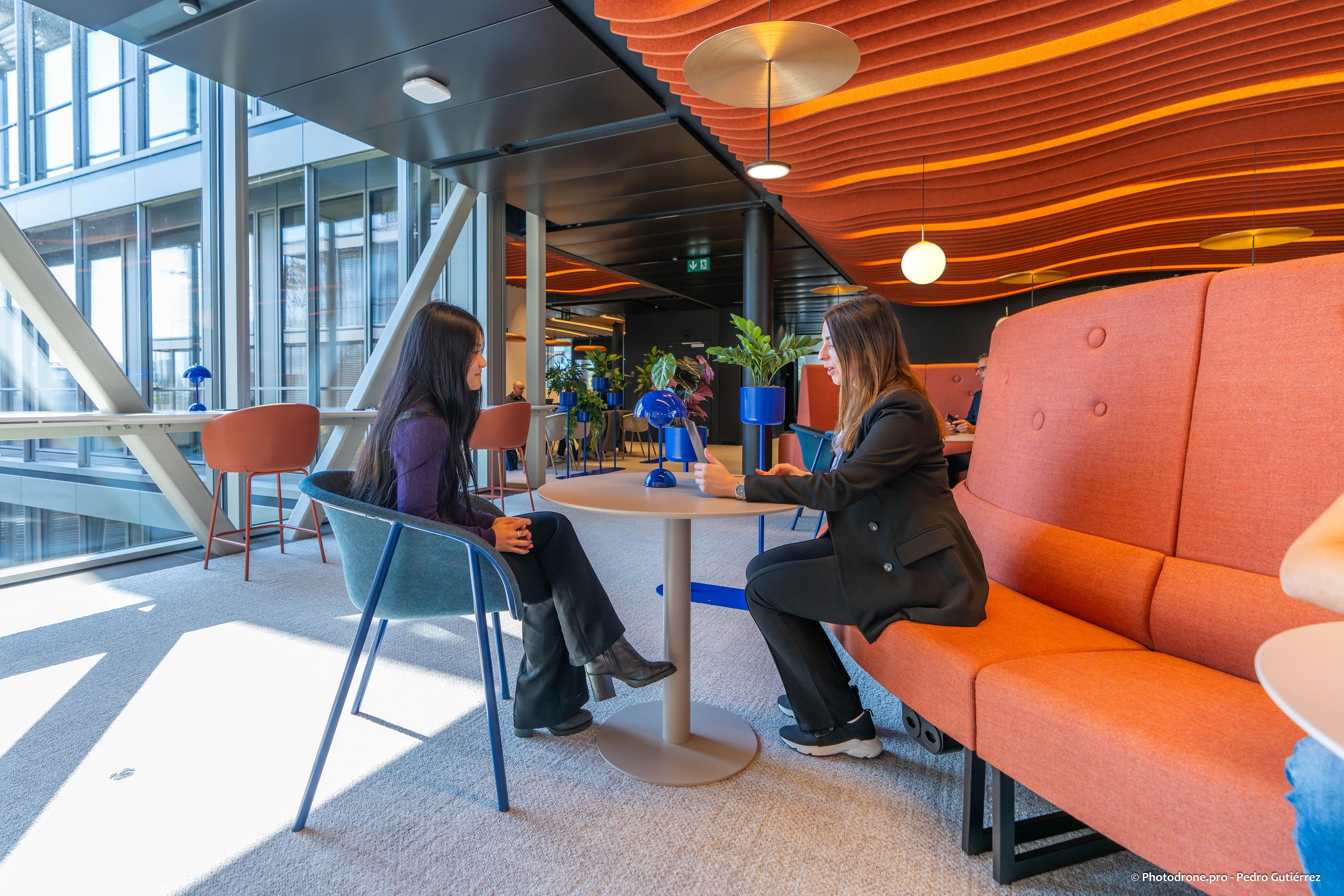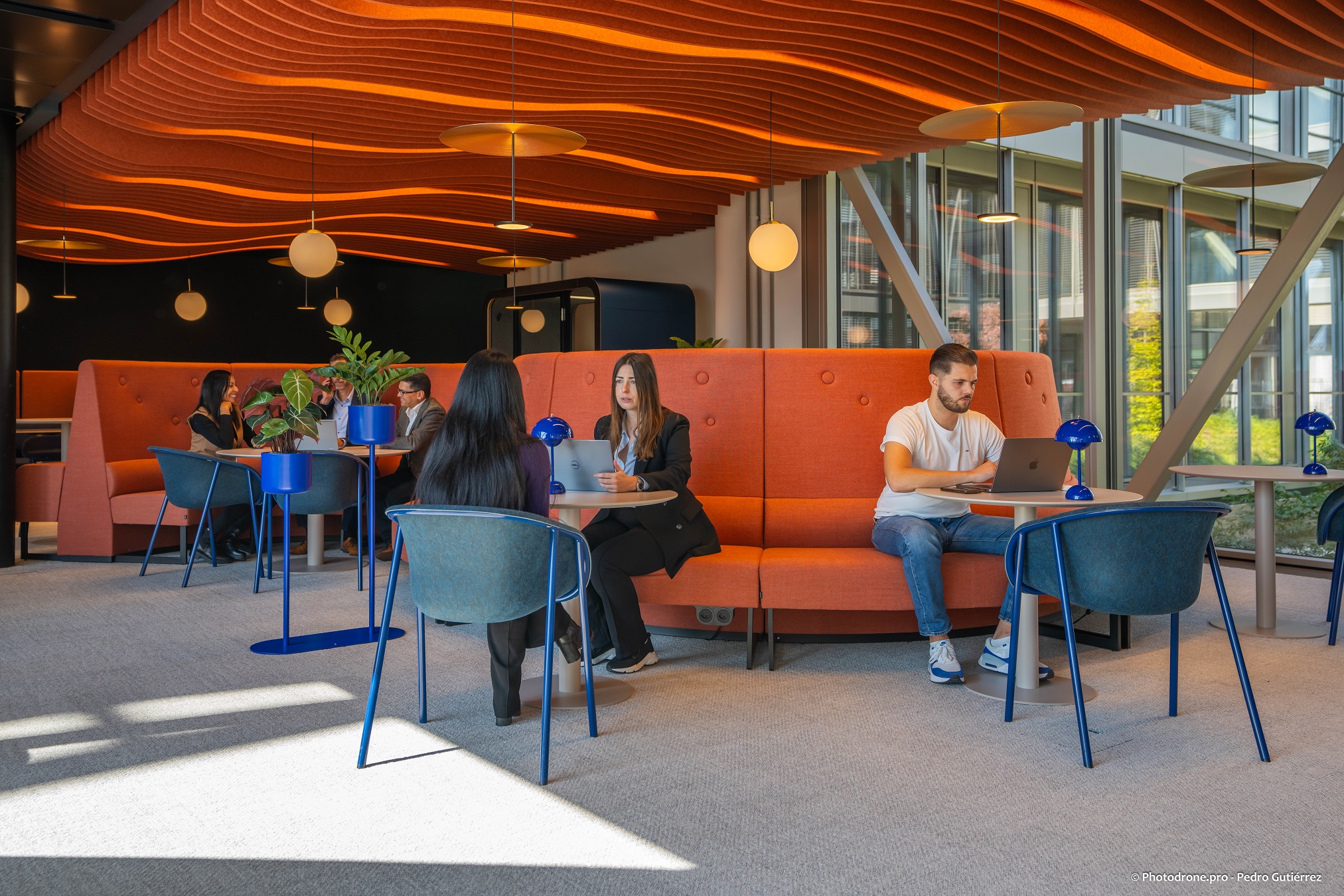 A coffee lounge and furnished areas for informal conversations on cozy sofas. Sun-exposed terraces that extend the workspace outdoors.